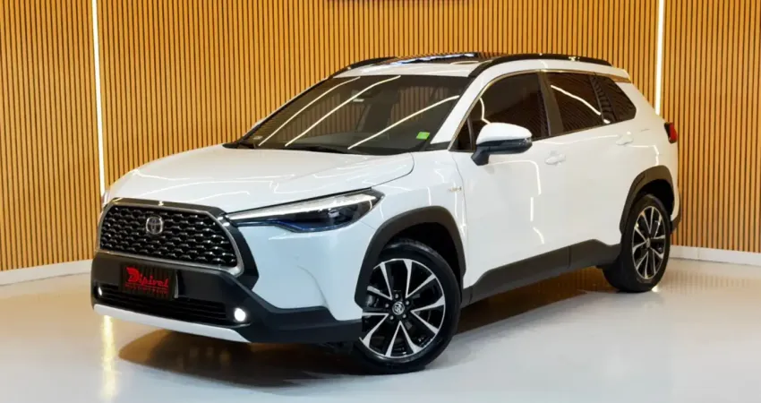 Toyota Corolla Cross XRX Hybrid, na cor branca, com 68.000 km rodados, em excelente estado de conservação.