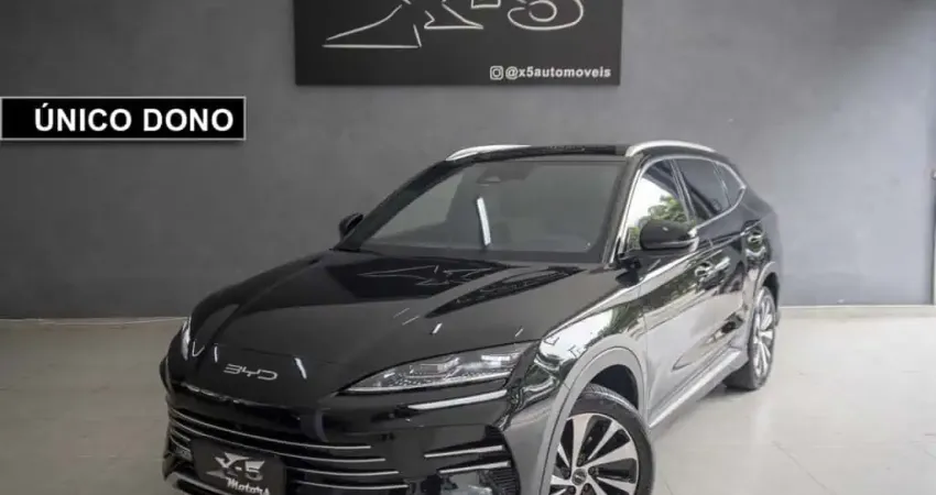 Exterior preto Delan, interior bi-color em couro azul e cinza claro, tração integral sob demanda, acabamentos externos em chromo, teto solar elétrico e panorâmico, rack de teto, câmera tridimensional, rodas diamantadas aro dezenove, repetidor de seta nos retrovisores, bancos dianteiros elétricos, conjunto óptico full LED, sistema de som Infinity com dez alto-falantes, abertura automática do porta-malas, assistente de permanência em faixa, controle de cruzeiro adaptativo, alerta de pontos cegos, limitador de velocidade, modos de condução, chave presencial, apoio de braço em couro, carregamento duplo por indução para smartphones, rebatimento eletrônico dos retrovisores, forração em couro no painel e portas, acabamentos em alumínio, carpetes em tecido, cintos de três pontos para os ocupantes, banco traseiro bipartido, ganchos internos organizatórios, luz de cortesia, saída de ar-condicionado para os passageiros, conexões USB e USB-C, soleiras BYD, multimídia central rotativa, painel de instrumentos digital, linhas-guias dianteiras e traseiras, freio de estacionamento eletrônico, encosto de cabeça para todos.