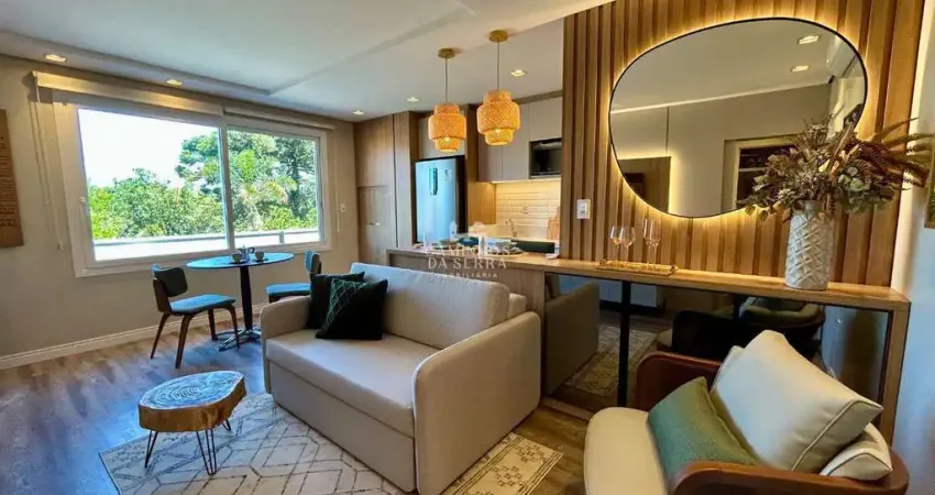 Apartamento Alto Padrão no Centro de Nova Petrópolis com 1 dormitório: O apartamento possui 49,99m² privativos, muito bem distribuídos e planejados, com 1 dormitório e ambientes cuidadosamente pensados para oferecer funcionalidade e bem-estar. Totalmente mobiliado e decorado, está pronto para morar ou investir. Conta ainda com 1 vaga de garagem. O excelente padrão de acabamento, os móveis planejados e a decoração moderna valorizam cada espaço, proporcionando conforto e elegância.