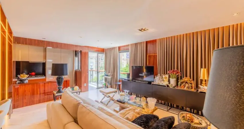 O living estendido é finamente decorado e integra-se à cozinha e à sacada, criando um ambiente social sofisticado e funcional, com posição solar agradável.