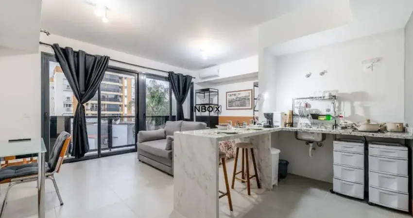 INBOX CIA IMOBILIÁRIA VENDE /ALUGA Studio no Anita Residence com 37m² privativos, totalmente mobiliado, cozinha com churrasqueira integrada à sala, eletrodomésticos, split, fechadura eletrônica, TV e 1 vaga de garagem.