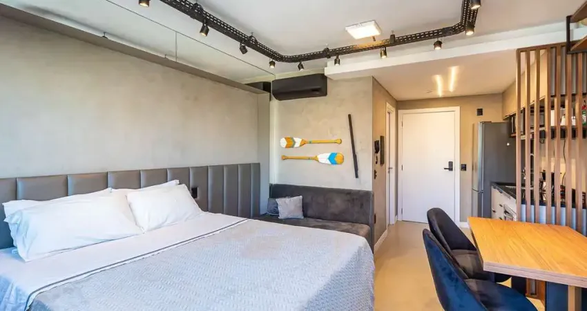 Apartamento studio decorado por arquiteto, totalmente mobiliado e equipado, 1 dormitório em andar alto com 26m² de área privativa e 1 vaga de garagem rotativa.