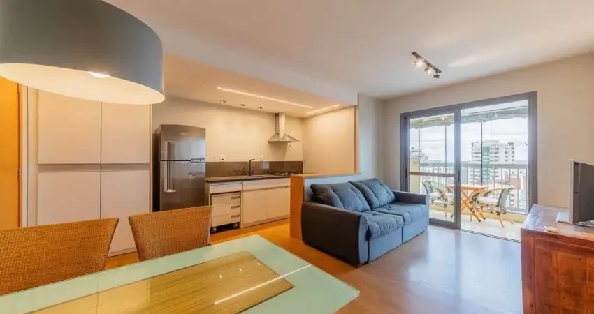 Este apartamento de luxo, localizado em andar elevado, é completamente mobiliado e possui 59m² de área privativa. A unidade conta com um dormitório, sala espaçosa, cozinha americana com água quente e área de serviço independente. A sacada com churrasqueira é um destaque à parte, perfeita para receber amigos e aproveitar momentos de lazer. O banheiro possui box de vidro e todos os móveis estão incluídos, entregando o imóvel no formato porteira fechada.