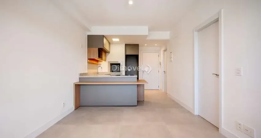 Apartamento com 1 dormitório, living dois ambientes, cozinha americana e banheiro com armários.
