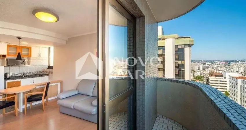 Flat 1 suíte com sacada de frente para a Praça do Tênis, 29,56m² de área privativa, arejado e iluminado com sol da manhã e tarde. Living e cozinha americana, mobiliado e pronto para morar. Serviços de flat: portaria, restaurante, academia, garagem rotativa, piscina, camareira. Localizado no Moinhos de Vento, próximo à Rua 24 de Outubro. Administrado pelo Mercure com sistema de Pool para investidores