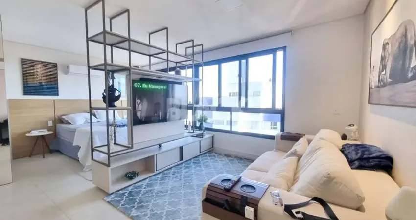Apartamento moderno estilo studio com cozinha americana, área de serviço, churrasqueira, living três ambientes, banheiro social, 50,10m² privativos, apartamento mobiliado e com vaga de garagem.