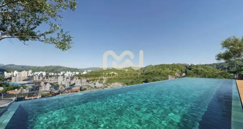 Piscina com borda infinita e vista panorâmica da cidade. Áreas comuns decoradas com padrão premium e iluminação cênica.