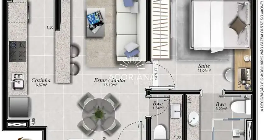 Amplitude de 44m²: Uma planta de 1 dormitório muito acima da média, garantindo conforto e circulação livre.