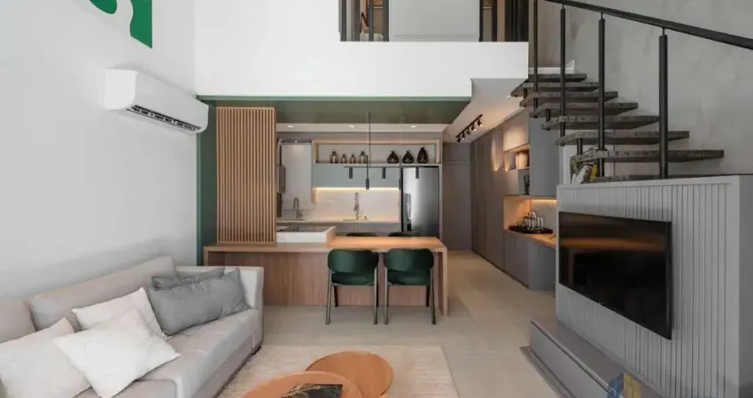 Apartamento loft garden com 1 suíte, 77,47 m² privativos, 1 vaga de garagem mobiliado e decorado.