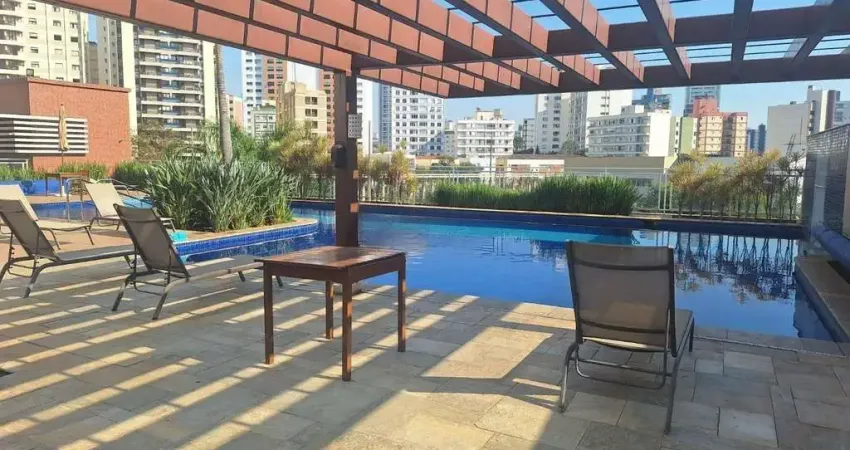 A sacada gourmet é um destaque, com armário planejado e sofá de palete, criando um espaço aconchegante e ideal para relaxar. O quarto dispõe de armário planejado, painel, cama Queen e ar-condicionado, enquanto o banheiro conta com gabinete, box em vidro, espelho e ducha com aquecimento a gás.