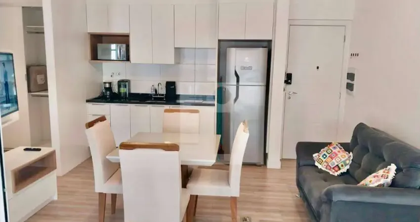 Possui 1 vaga de garagem e está mobiliado com cooktop, geladeira, cama box, sofá 2 lugares, sala de jantar com 4 cadeiras, ar condicionado, fechadura eletrônica, TV 43 , purificador de água, internet, cafeteira, ferro de passar, secador de cabelos, microondas, mesa e cadeira de escritório, armários na cozinha, banheiro e quarto.