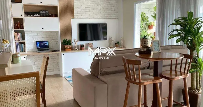 O imóvel possui 54,00 m² de área útil, que são distribuídos em 1 quarto com (armário embutido), 1 banheiro social equipado com (box em vidro, espelho e gabinete), cozinha planejada em estilo americana, sala de 2 ambientes climatizada, sacada gourmet com uma bela vista panorâmica da cidade, e, 1 vaga de garagem coberta no condomínio.