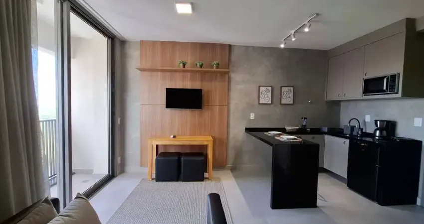 O imóvel é totalmente funcional e bem distribuído, contando com cozinha equipada com móveis planejados, micro-ondas e frigobar, integrada ao ambiente principal. A área de estar possui painel de TV, ar-condicionado e sofá com cama queen, proporcionando conforto e versatilidade no dia a dia.