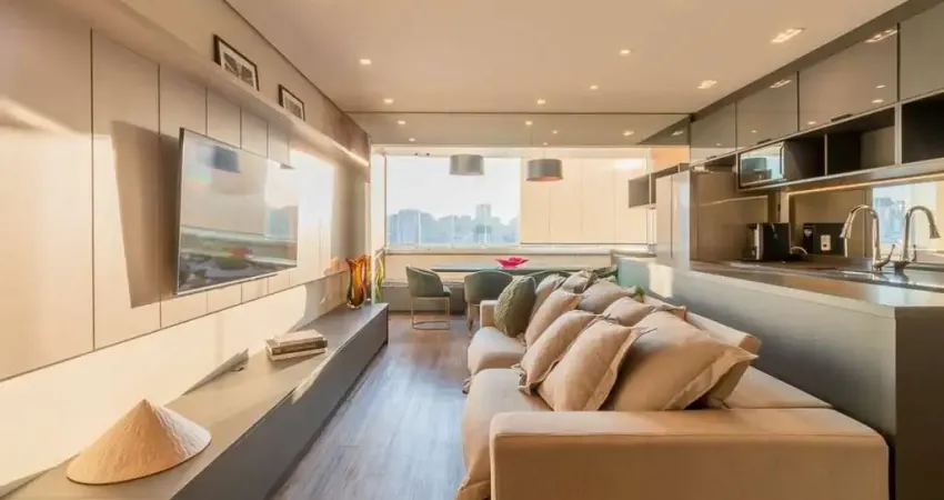 Sala com fechamento de varanda, lavabo, armários embutidos, sofá, tv de 69 polegadas na sala, rack, mesa de jantar com 4 poltronas verdes e banco, cooktop, geladeira de 2 portas, microondas.
