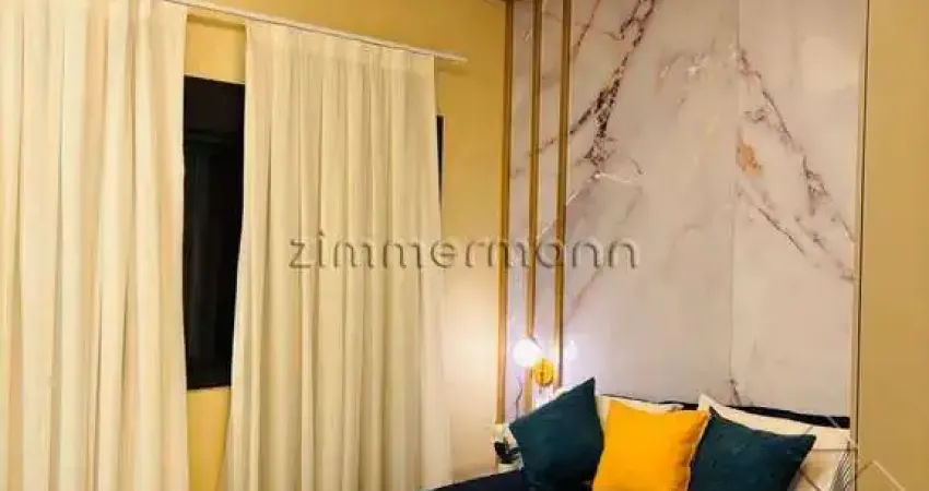 Studio mobiliado, pronto para morar, com ar-condicionado, cama box, geladeira, micro-ondas, armários planejados e acabamento moderno.