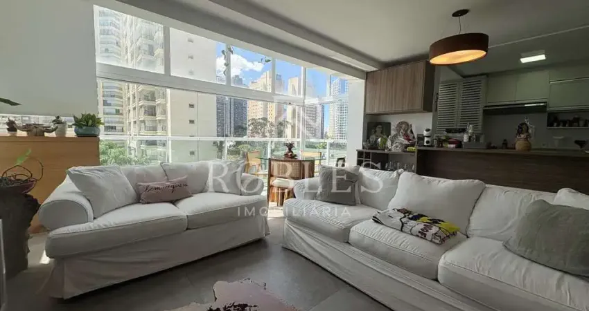 Apartamento duplex mobiliado, com ambientes bem distribuídos e funcionais. A área social conta com sala de estar e TV integrada à sala de jantar e à cozinha. O janelão do piso ao teto proporciona excelente iluminação natural e sensação de amplitude. A suíte master é espaçosa, com marcenaria de excelente qualidade e ótima organização. Todos os ambientes são climatizados e o imóvel possui uma vaga de garagem.