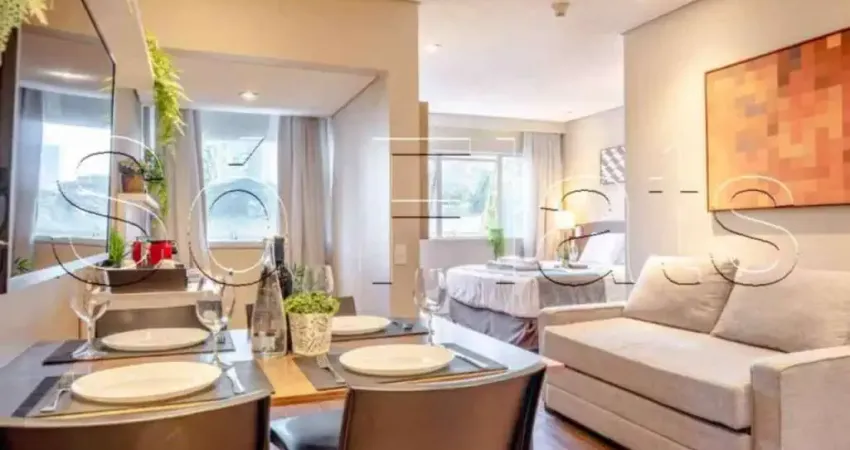 O apartamento no modelo Studio, mobiliado e equipado, com 32m², 1 dormitório, mesa para trabalho e 1 vaga de garagem.