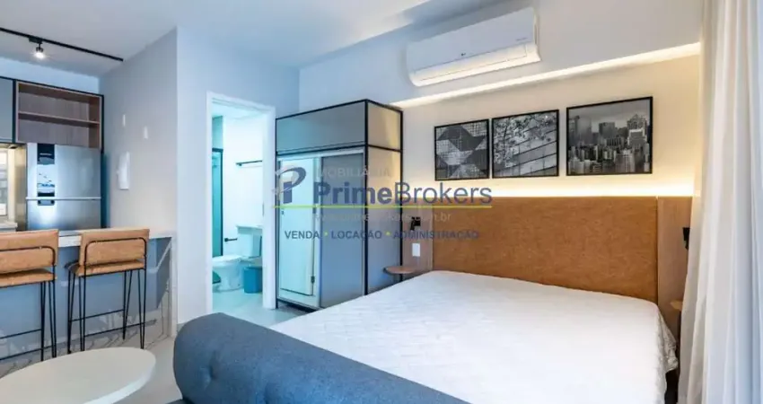 Studio mobiliado e decorado, cozinha equipada com eletrodomésticos (micro-ondas, cooktop, geladeira), máquina de lavar e secar roupas, ar-condicionado, TV Smart, fechadura eletrônica, armários planejados, cama, sofá