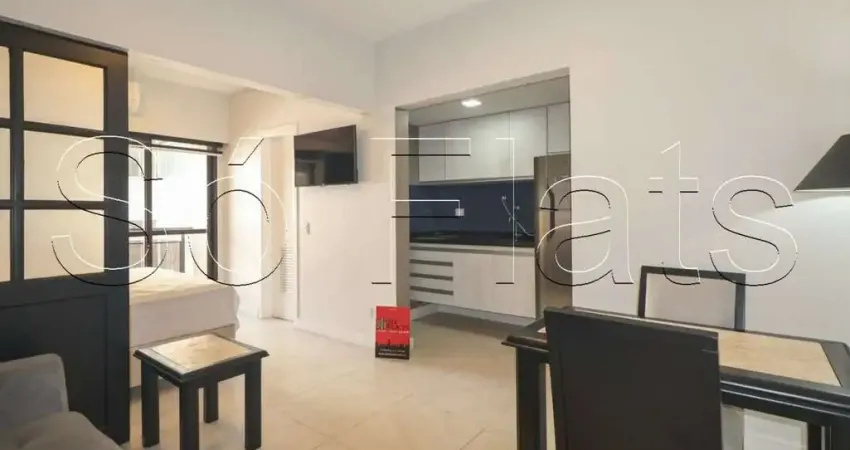 Apartamento mobiliado e equipado com 30m² bem aproveitados, 1 dormitório suíte, sala confortável integrada à cozinha americana completa com balcão, varanda, closet funcional e 1 vaga de garagem.