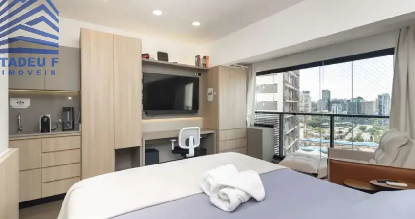 Com 27 m², o estúdio possui planta inteligente, ambientes integrados e excelente aproveitamento de espaço. A varanda integrada amplia a área social e oferece vista aberta, criando um ambiente acolhedor e funcional.