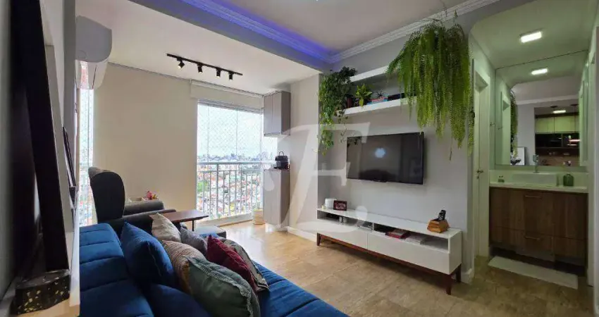 1 dormitório com armários, banheiro social, sala para 2 ambientes, varanda integrada com fechamento em vidro, cozinha americana com armários, área de serviço e 1 vaga de garagem.