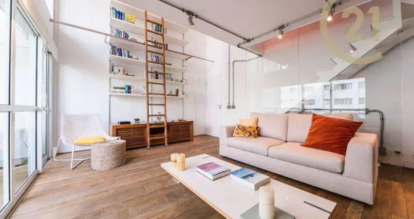 O lindo apartamento Loft capa de revista mobiliado para venda porteira fechada ou locação com 74m2, 1 suíte, lavabo, ar condicionado, Já foi capa de revista de decoração e tem acabamentos diferenciados: deck na varanda, piso em madeira de demolição, móveis Vermeil, estante e armários da suíte da Ornare, bancadas de limestone no lavado e na suíte, com 2 vagas de garagem.