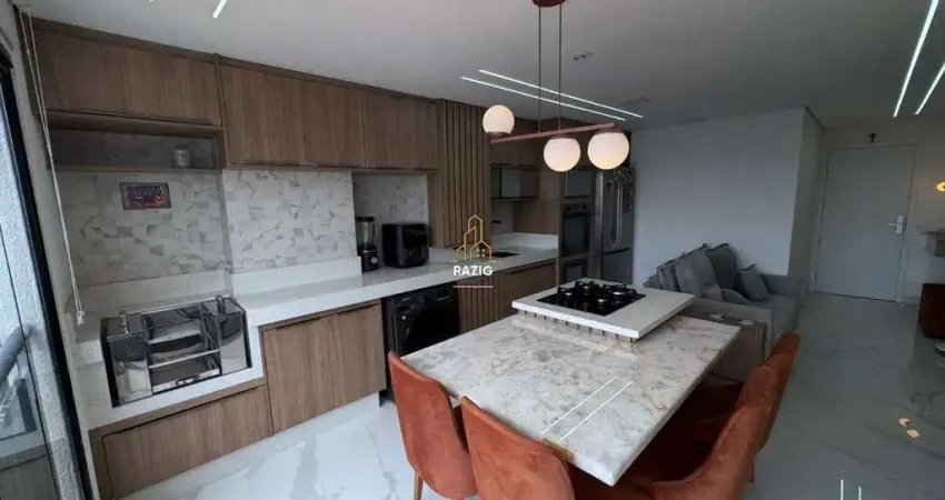 Fechamento de sacada com vidros e cortinas black-out. Porta com fechadura digital. Piso em porcelanato alto padrão 1.20 X 1.20. Ar condicionado. Ficarão os móveis planejados em todos os ambientes, sala com rack e painel, hall de entrada com espelho e luminária, área de café / bar com cristaleira e espaço para adega. Cozinha com armários e vidros espelhados e ampla bancada em granito branco estelar. Ilha com cooktop e mesa em pedra ônix natural. Churrasqueira na sacada. Dormitório com armários e portas com espelho. Banheiro reformado possui armários e espelho. Caixa de som embutido no teto para som ambiente e conexão wifi para TV.