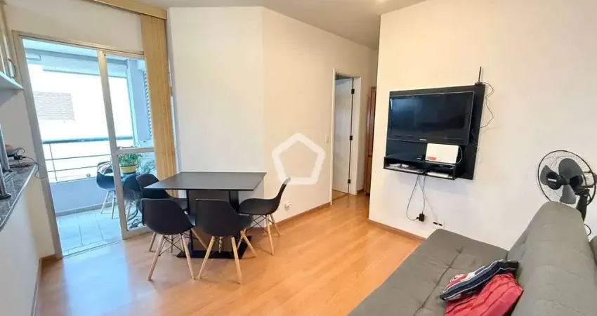 Apartamento com cozinha americana, 1 quarto, 1 banheiro e 1 vaga.