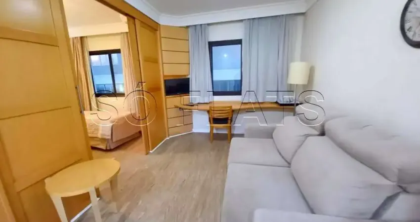 Apartamento mobiliado de 35m², com 1 suíte, sala integrada, cozinha americana e 1 vaga de garagem. Condomínio com serviços hoteleiros completos.