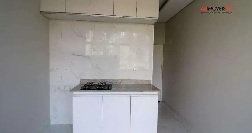 Kitnet 'tipo C' de 1 quarto suíte com armários, bancada em granito e fogão cooktop, banho suíte com box blindex, bancada em granito e armário.