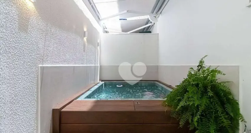 Apartamento garden com piscina com hidromassagem e cromoterapia, toldo elétrico com proteção solar para maior privacidade, deck em madeira ecológica, bancada gourmet e armários; composto por: