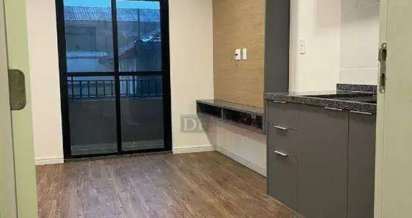 Apartamento, estilo Studio, novo, com 30m², próximo ao metrô Bresser Mooca, com um dormitório e sacada. A unidade conta com banheiro acessível, móveis planejados na cozinha, painel de TV, frigobar, cama e gabinete no banheiro.
