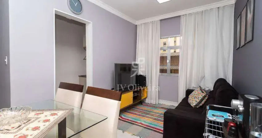 Apartamento de 50m² todo reformado com um dormitório, sala co dois ambientes, um banheiro, e sem vaga de garagem.