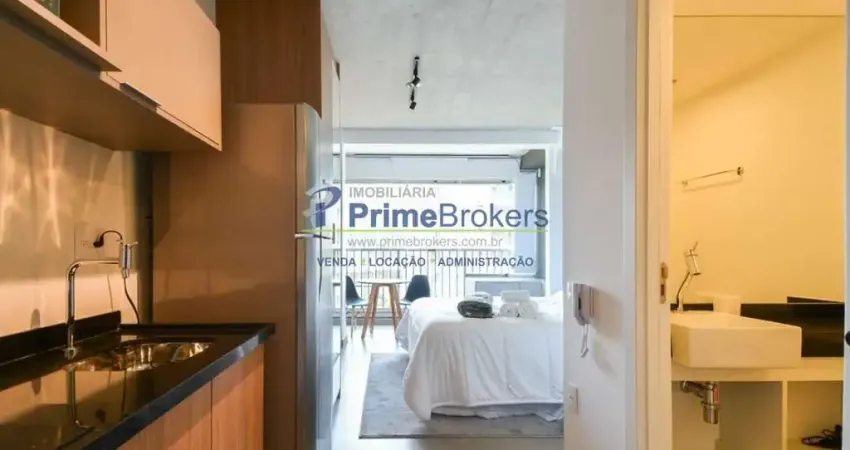 Studio mobiliado com eletrodomésticos, ar-condicionado instalado, sistema de água quente, sacada com vista, interfone, quarto e banheiro bem planejados