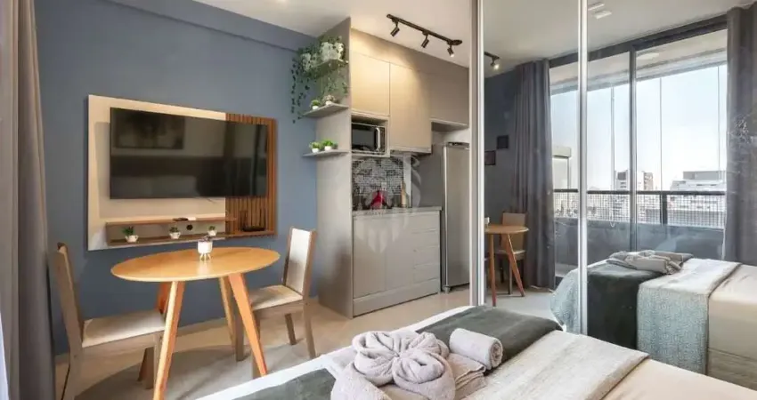 - O studio é entregue com enxoval completo de cama, mesa e banho, pronto para morar ou alugar imediatamente.