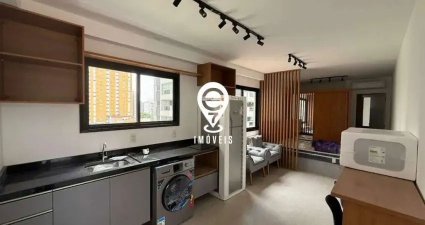- Com 29,27 m² de área útil, 1 Quarto com cama box e armário, Varanda com vista livre, 1 Banheiro com box de vidro, Sala com ar condicionado, sofa de 2 lugares e estante. Cozinha equipada com armários planejados, micro-ondas, Cooktop de Indução.