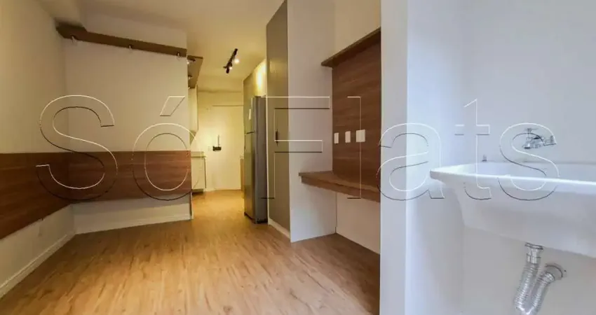 Condomínio moderno com elevador, salão de festas e churrasqueira, atendendo ao perfil mais buscado por quem procura studio para morar ou studio para locação em região valorizada de São Paulo.
