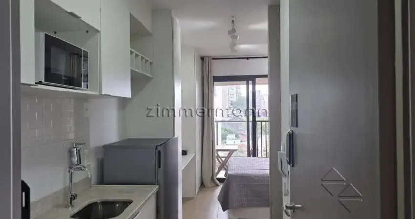 Studio de 25m² MOBILIADO com ampla varanda (Garden), no contra piso, correspondente ao terceiro andar em relação ao térreo. Ótima iluminação natural.