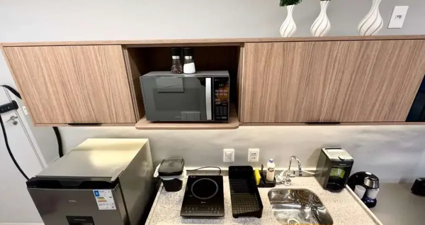 - Cozinha equipada: Geladeira, Microondas, Cooktop, Air Fryer, Cafeteira e Utensílios gerais (Louças, panelas, talheres, potes)