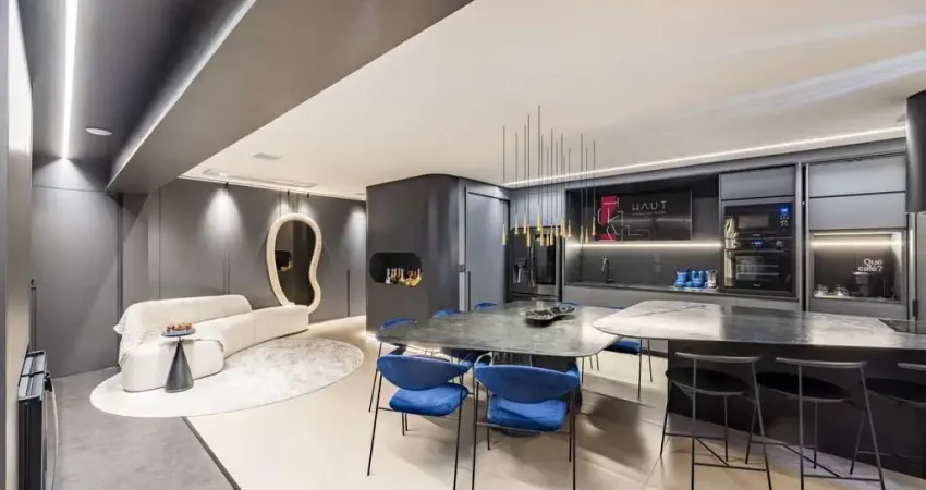 A cozinha, com sua ilha central em mármore negresco escovado, é o ponto de encontro perfeito entre design moderno e praticidade. O espaço de jantar é uma declaração de bom gosto, com pendentes assinados por Jader Almeida e o toque sutil das cadeiras Agda, que trazem um leve contraste azul ao ambiente. Cada canto desse apartamento foi pensado para oferecer uma experiência de moradia incomparável. A tecnologia também é parte integrante deste imóvel, totalmente automatizado para proporcionar praticidade e conforto no dia a dia.