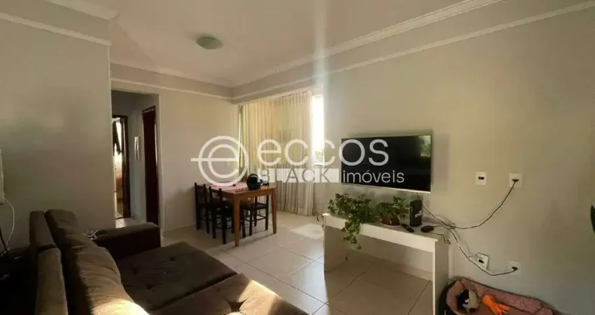 Apartamento na região sul de Uberlândia, com 65m² de área privativa, composto por sala em dois ambientes, dois quartos com armários, sendo um suíte, banheiro social, cozinha com armário sob a pia, área de serviço e uma vaga de garagem, em condomínio com água inclusa.