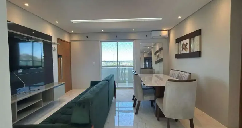 Apartamento todo mobiliado com aproximadamente 64,4?m² de área total, sala em dois ambientes com sacada e ar-condicionado, hall para dois quartos, sendo um suíte com sacada e ar-condicionado, banheiro social com box e armário, cozinha com armário, área de serviço com armário e uma vaga de garagem, elevador.