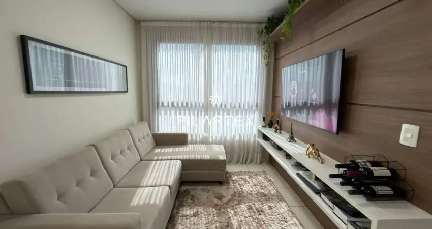 Apartamento com 2 quartos, sendo 1 suíte, ambos os quartos com móveis planejados. Sala em 2 ambientes (estar e jantar), cozinha com planejados, área de serviço e 1 vaga de garagem. Apartamento em andar intermediário, com sol poente.
