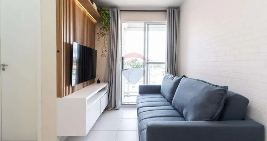 O apartamento possui 47m² de área útil, sendo sala para 2 ambientes, cozinha com móveis planejados, área de serviço, 2 quartos com armários, banheiro social e sacada com churrasqueira. Os espaços independentes e otimizados proporcionam conforto e privacidade.