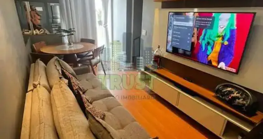 Apartamento de 57m² com dois quartos, sendo um suíte com ar split e armários planejados, sala em dois ambientes, cozinha e área de serviço, varanda, banheiro social.