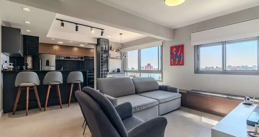 Banco Patrimonial Imobiliária vende apartamento moderno com 75m² de área privativa, originalmente de três dormitórios, atualmente com dois dormitórios, sendo uma suíte e living estendido, criando um ambiente sofisticado e aconchegante.