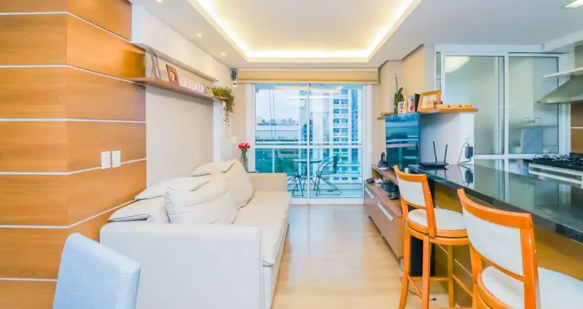 Possui living para dois ambientes com cozinha americana e sacada integrada, área de serviço separada.