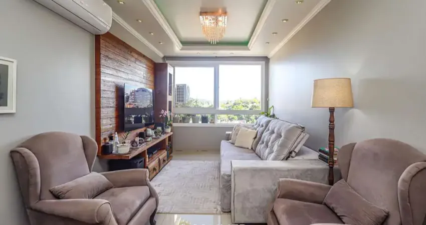 Apartamento semimobiliado com 72 m² de área privativa com 2 dormitórios sendo 1 suíte, banheiro social com ventilação natural, living amplo para 3 ambientes com lareira, cozinha montada com churrasqueira e área de serviço individual. Possui 2 vagas de garagem cobertas e escrituradas.