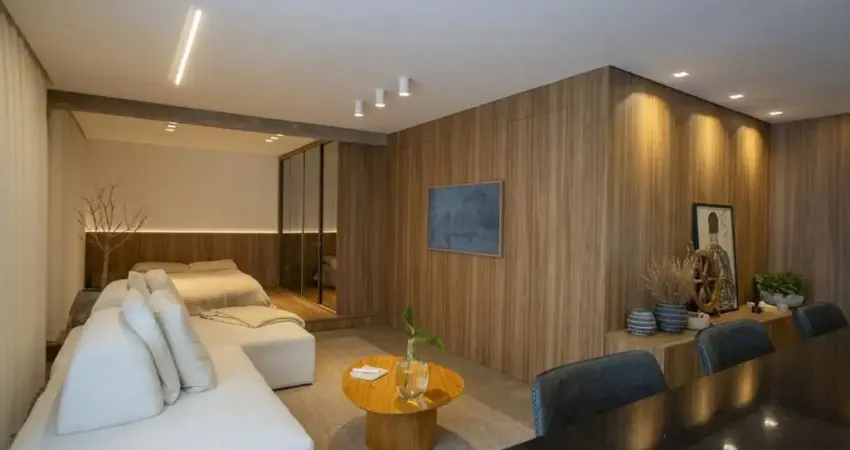 A cozinha integrada em tons escuros traz um ar moderno e elegante, com marcenaria sob medida e iluminação em LED. A área social é envolvente e charmosa, com painéis amadeirados que trazem aconchego e sofisticação aos ambientes. O dormitório principal foi integrado à sala, criando um espaço amplo, leve e inspirador - perfeito para viver e receber com estilo.
