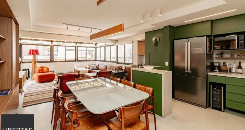 02 suítes, uma delas com closet, banheira, cozinha americana integrada com a sala de estar, lavado, churrasqueira, piscina na área externa ensolarada e 2 vagas de garagem.